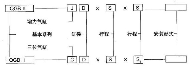 QGB||-J 系列为增力气缸,前后两活塞杆联为一体,其杆端输出力为单活塞推、拉力之和,拉力为单活塞拉力二倍。此产品也可作为气压阻尼气缸应用。QGB||-C系列为三位气缸前后两活塞杆单独分开。当前缸行程(S)大于后缸行程(S1)时,前端活塞杆头有三个位置。